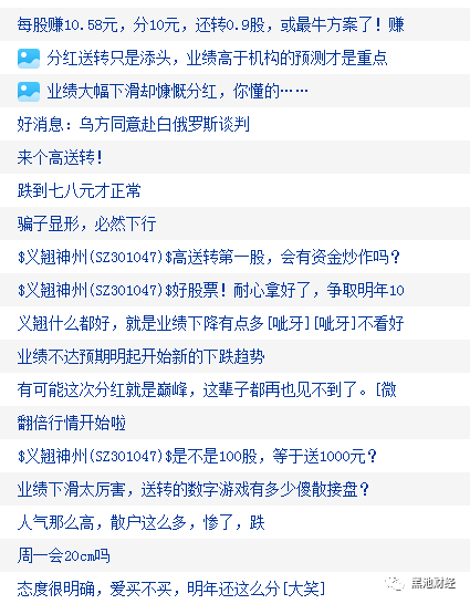 对此,股民们的评论也出现了两极分化,有股民直言,“好公司啊,挣这点钱全分红了”,“向充分考虑中小投资者利益的义翘神州高管团队致敬”,也有股民表示“人气那么高,散户这么多,惨了,跌”、“业绩下滑太厉害,送转的数字游戏有多少傻散接盘?”......