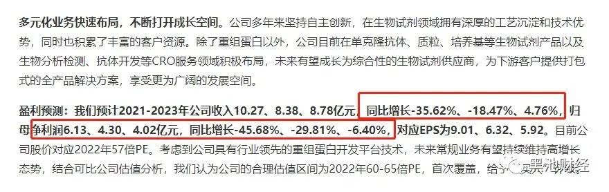开源证券去年12月的研报也预测义翘神州最近几年业绩下滑,预计其2021-2023年营业收入分别是10.74、8.85、9.49亿元,归母净利润分别为6.84、5.06、4.59亿元。