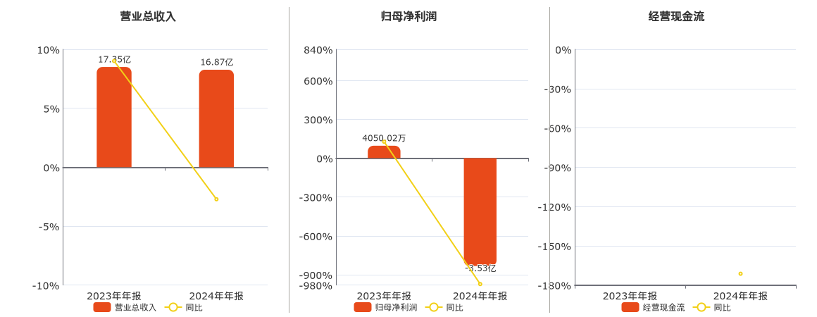 公司营业总收入为16.87亿元,较去年同报告期营业总收入减少4726.17万元,同比较去年同期下降2.72%。归母净利润为-3.53亿元,较去年同报告期归母净利润减少3.94亿元,同比较去年同期下降972.54%。经营活动现金净流入为-9009.48万元,较去年同报告期经营活动现金净流入减少2.16亿元,同比较去年同期下降171.37%。