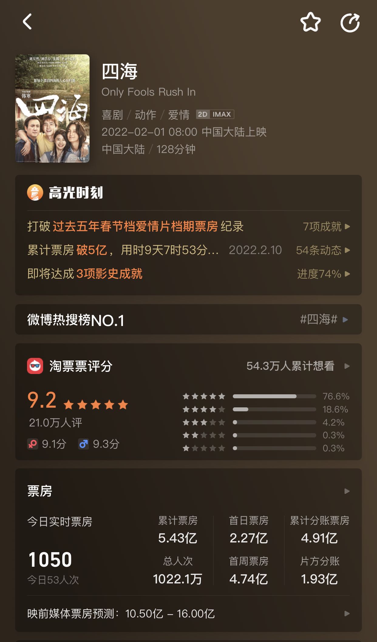灯塔专业版显示,《四海》累计票房约5.43亿,片方分账1.93亿。该影片含上海亭东影业有限公司、阿里巴巴影业(北京)有限公司等6个出品方,联合出品包括上海电影(集团)有限公司、果麦文化传媒股份有限公司等。