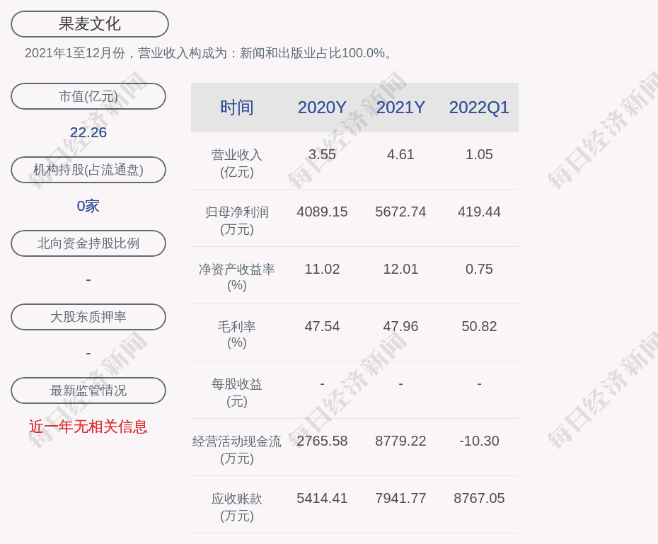 2021年1至12月份,果麦文化的营业收入构成为:新闻和出版业占比100.0%。