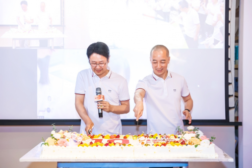 路金波和果麦文化总裁瞿洪斌(左)在切果麦十周年生日蛋糕