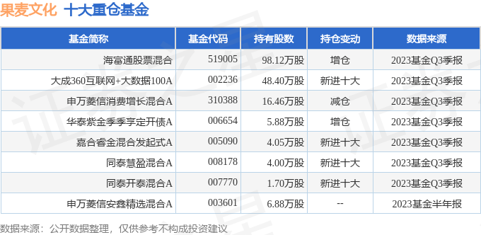 持有果麦文化最多的基金为海富通股票混合,目前规模为25.25亿元,最新净值0.9928(10月27日),较上一交易日下跌0.26%,近一年下跌28.11%。该基金现任基金经理为吕越超。