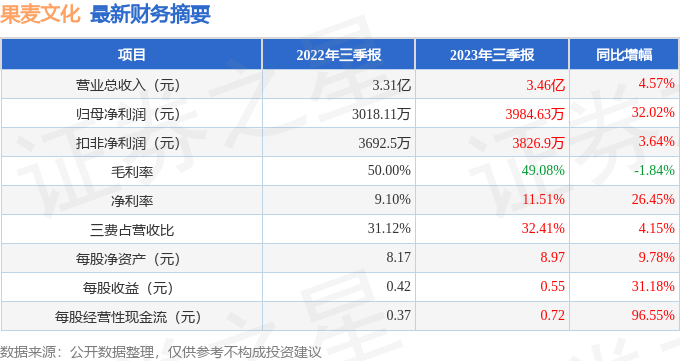 据证券之星公开数据整理,近期果麦文化(301052)发布2023年三季报。根据财报显示,本报告期中果麦文化营收净利润同比双双增长。截至本报告期末,公司营业总收入3.46亿元,同比上升4.57%,归母净利润3984.63万元,同比上升32.02%。按单季度数据看,第三季度营业总收入1.09亿元,同比下降3.7%,第三季度归母净利润1046.09万元,同比下降24.34%。
