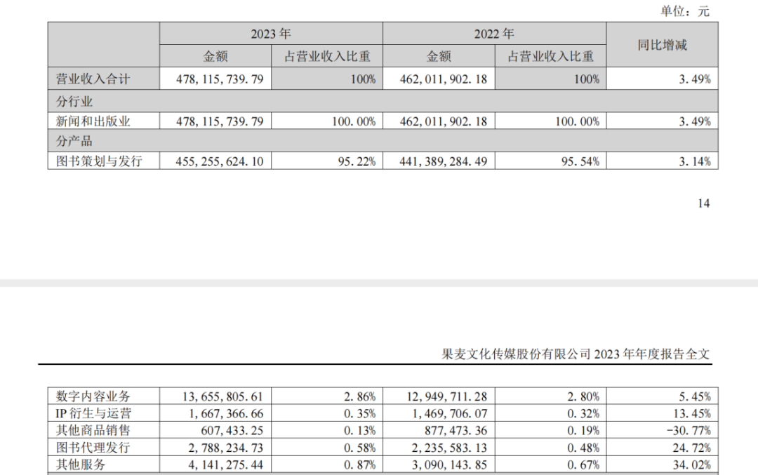据其2023年年报,2022年、2023年,图书策划与发行业务分别占果麦文化营业收入的比重为95.54%及95.22%。