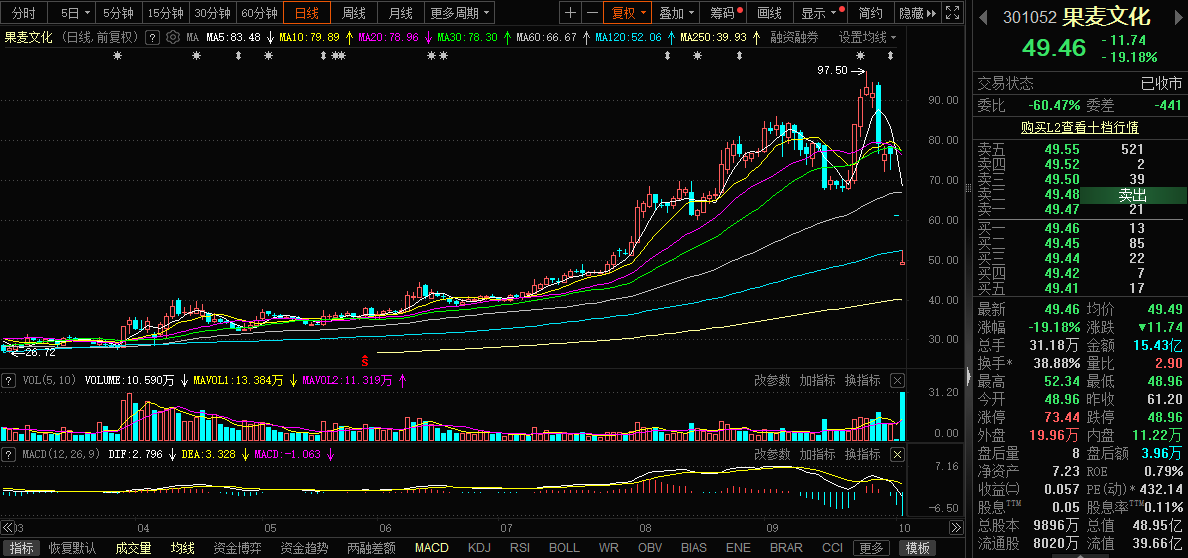 公告发布后的首个交易日(10月9日),公司股价直接以20cm跌停收盘;截至节后第二个交易日,股价进一步下探至49.46元/股,相较于9月30日的公告日收盘价,短短两个交易日内跌幅已达35.35%,前期部分涨幅被快速回吐。