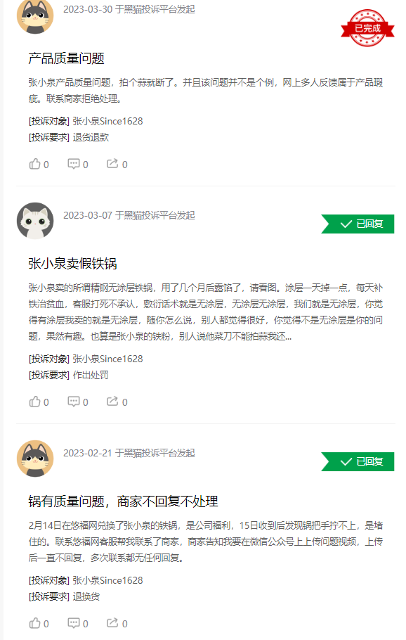 浏览黑猫投诉平台,截至2023年11月28日,累计投诉达32件,数量真心不多但需警惕的是,投诉多指向“产品质量问题”、“产品普遍存在瑕疵”、“菜刀断柄”等质疑。
