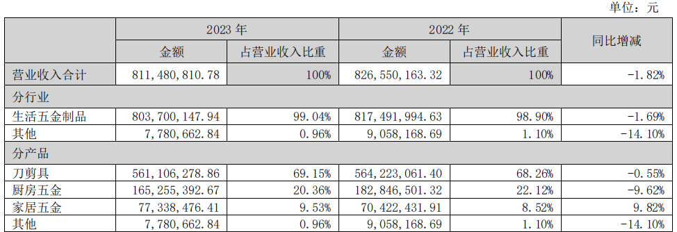 分产品来看,张小泉2023年的刀剪具类目实现收入 5.61亿元,同比下降 0.55%;厨房五金类目实现收入1.65亿元,同比下降9.62%;家居五金类目实现收入0.77亿元,同比增长9.82%。