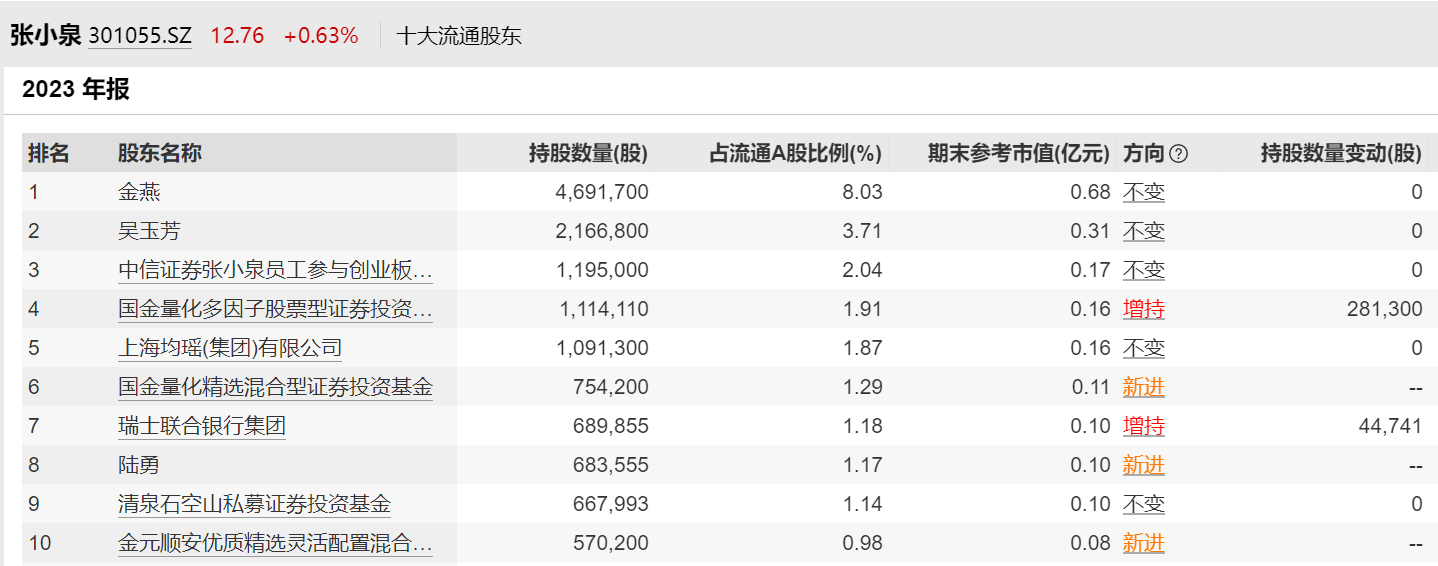 和2023年三季报相比,张小泉的前十大流通股股东略有变化,原本持股的国金量化多因子基金增持28.13万股,以持有111.41万股位列第4大流通股股东;原本持股的瑞士联合银行集团增持4.4741万股,以持有68.9855万股位列第7大流通股股东。