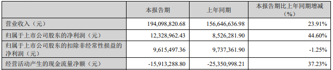 2025年一季度,公司营业收入1.94亿元,同比增长23.91%;归属于上市公司股东的净利润1232.90万元,同比增长44.60%;归属于上市公司股东的扣除非经常性损益的净利润961.55万元,同比减少1.25%;经营活动产生的现金流量净额-1591.33万元,上年同期为-2535.10万元。
