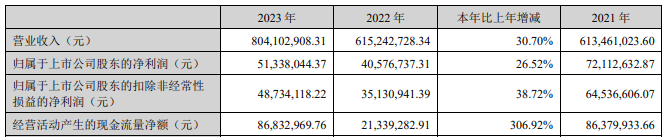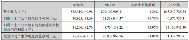 上市首年,即2021年,为汇隆新材净利最高点。2021年至2024年,公司营业收入分别为6.13亿元、6.15亿元、8.04亿元、8.38亿元,归属于上市公司股东的净利润分别为7211.26万元、4057.67万元、5133.80万元、3092.52万元,归属于上市公司股东的扣除非经常性损益的净利润分别为6453.66万元、3513.09万元、4873.41万元、3120.62万元,经营活动产生的现金流量净额分别为8637.99万元、2133.93万元、8683.30万元、8595.65万元。