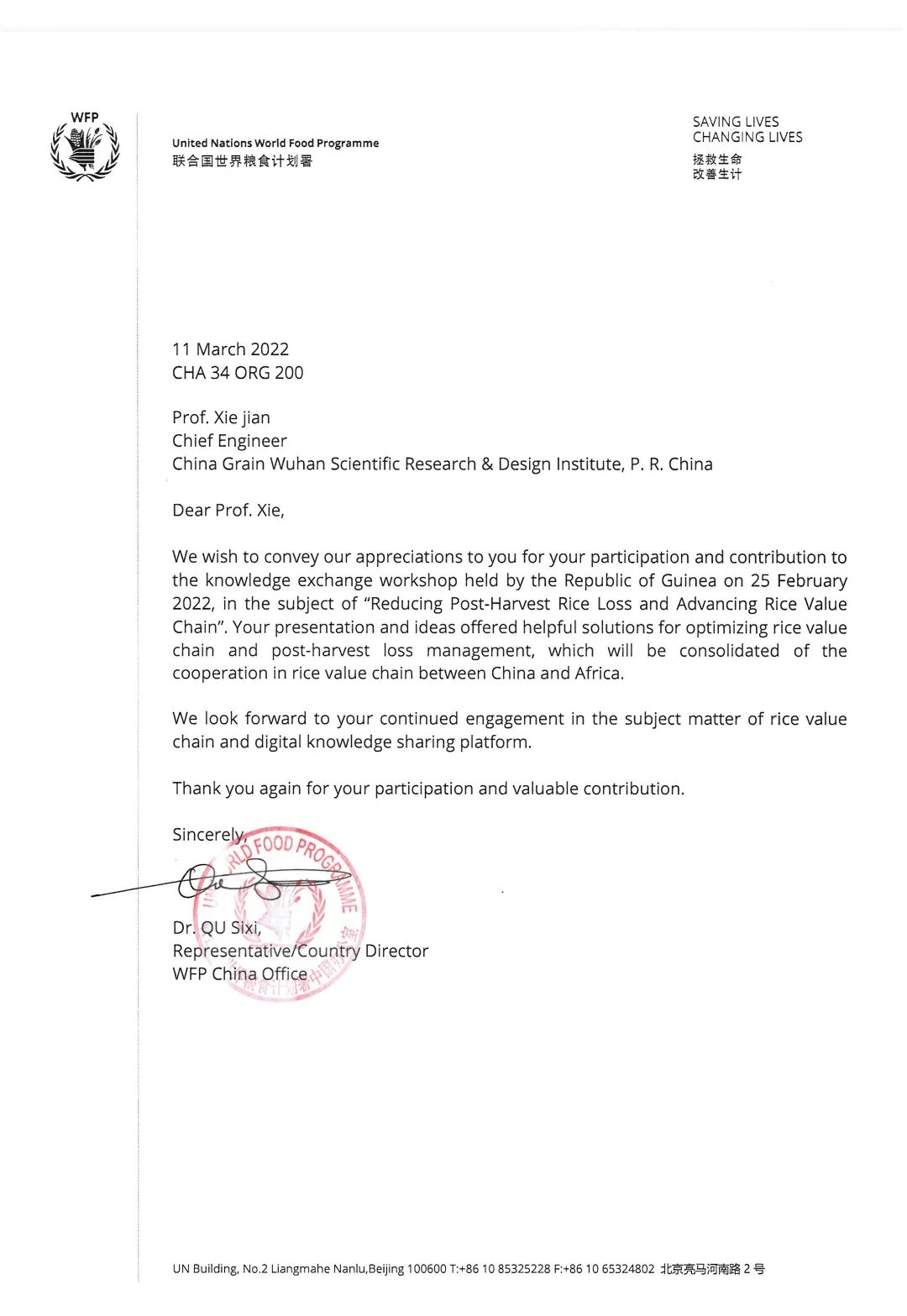 3月15日,中粮工科武汉事业部收到来自联合国世界粮食计划署(WFP)中国办公室的感谢信,感谢中粮工科资深技术专家谢健对“南南合作”工作的大力支持、对“减少水稻产后损失”技术与实践的有益分享和对巩固中非水稻价值链合作作出的突出贡献。