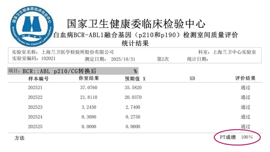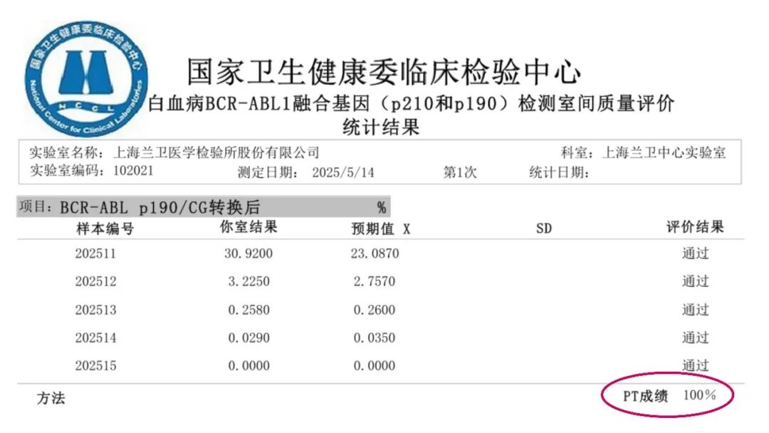 近日,国家卫生健康委临床检验中心(NCCL)发布了2025年“白血病BCR-ABL1融合基因(p210和p190)检测室间质量评价”报告。上海兰卫医学检验所股份有限公司2025年两次均以满分成绩通过了项目评价,充分体现了兰卫医学在血液肿瘤领域的专业性和准确性。