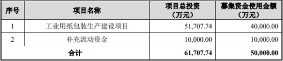 2023年6月30日,上海艾录披露的向不特定对象发行可转换公司债券募集说明书(上会稿)显示,本次向不特定对象发行可转换公司债券的募集资金总额不超过50,000.00万元(含本数),扣除发行费用后,募集资金拟投资于工业用纸包装生产建设项目、补充流动资金。
