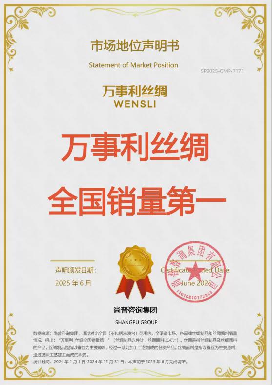尚普咨询集团成立于2008年,是中国最早成立的专业市场研究公司之一,也是首批取得国家统计局涉外调查许可资质的咨询机构。已为伊利、公牛、红牛等1000+行业头部及领先企业完成市场地位证明。此次“万事利丝绸销量全国第一”认证基于万事利对全国(不包含港澳台地区)范围内全渠道市场各品牌丝绸制品及丝绸面料销量的全面统计与对比分析。