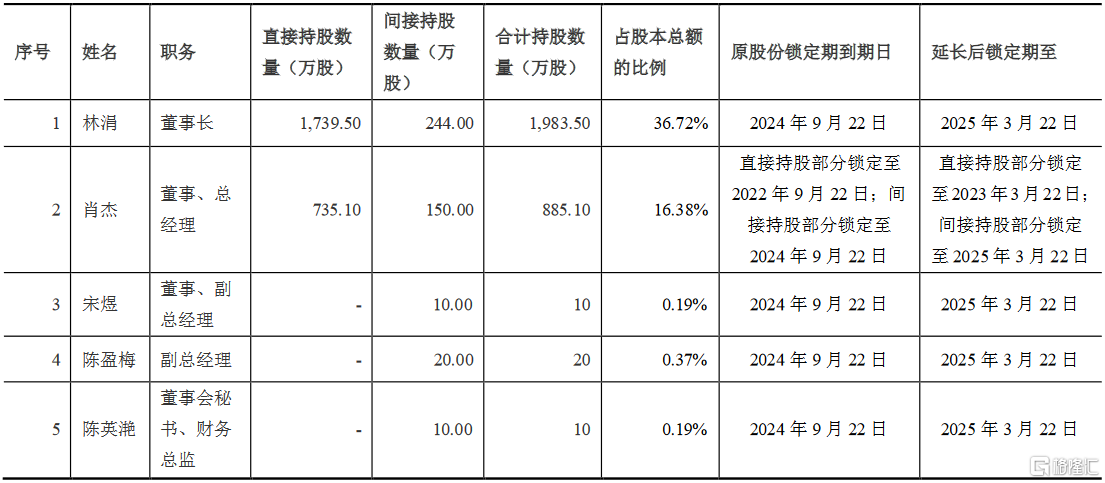 公司控股股东、实际控制人、董事林涓、董事及高级管理人员肖杰、宋煜、高级管理人员陈盈梅、陈英滟持有有限售条件流通股的情况及本次延长限售锁定期的情况如下表所示: