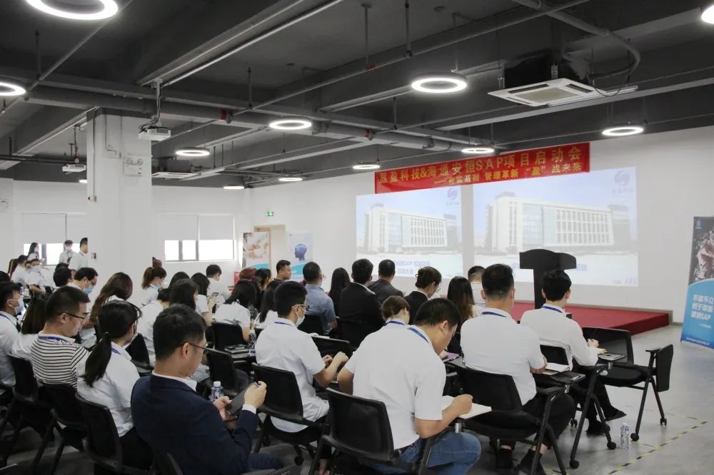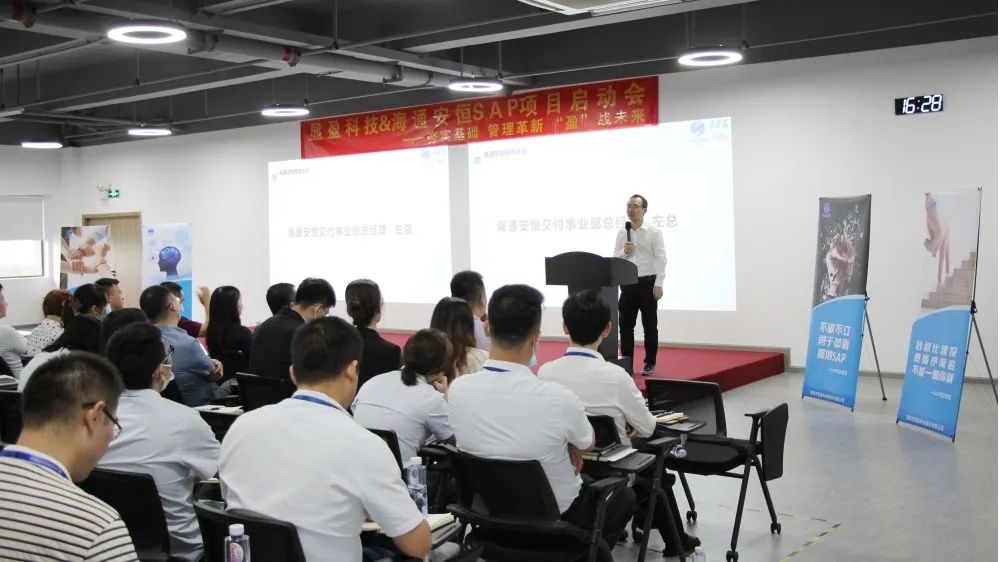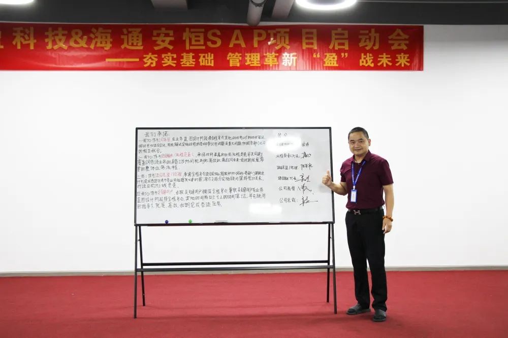 SAP项目的双方公司负责人,海通安恒项目总监黄呐和显盈科技项目总监陈英滟依次发言,发言中提到,在经过长时间的评估和协商,决定共同合作SAP项目的实施,感谢对方的相信任和能力的认可,希望在双方的合作下,克服困难,团结一致,SAP项目成功上线。