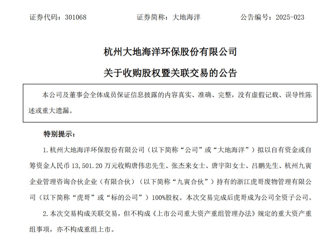 大地海洋6月3日公告,公司拟以自有资金或自筹资金人民币13,501.20万元收购唐伟忠、张杰来、唐宇阳、吕鹏、杭州九寅企业管理咨询合伙企业(有限合伙)持有的浙江虎哥废物管理有限公司100%股权。