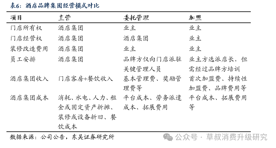 酒店连锁集团主要通过直营、委托管理和特许加盟模式进行扩张。直营模式下,公司拥有门店的所有权和经营权,对自有或租赁物业装修完成后,独立负责酒店的经营管理,承担酒店运营风险。委托管理模式下,酒店的所有权和经营权分离,业主拥有酒店所有权;受委托的品牌集团派驻店长、进行日常运营,收取基本管理费、奖励管理费等。加盟模式下,酒店品牌不直接负责酒店的管理和运营,授权业主方使用品牌、管理体系、数字化平台等,业主方掌握所有权和经营权,承担相应风险,酒店集团收取首次加盟费、持续加盟费、品牌费用等。