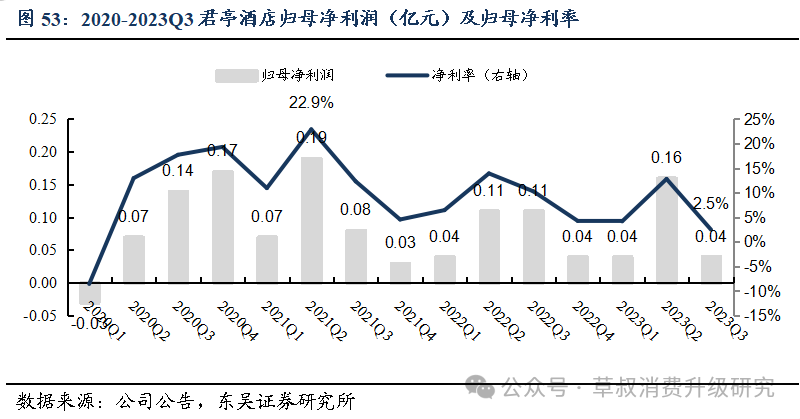 疫情阶段性影响营收利润,直营酒店量价恢复弹性。疫情期间出行需求影响公司营收利润,2019-2022年归母净利润CAGR为-19.66%。2023年随着居民商务和休闲出行的快速恢复,盈利能力大幅修复,2023年Q1-Q3公司实现归母净利润0.24亿元,同比-7.54%,归母净利率为6.28%。目前君亭系的扩张仍以直营为基础,重点突破核心城市,高端市场的持续扩张使得酒店房价呈现结构性提升。2023Q3君亭直营酒店OCC / ADR /Revpar已分别恢复至2019年同期水平的101%/125%/125%。