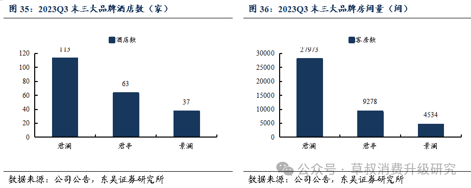 三大品牌定位互补,深耕高端度假与商旅酒店行业。君亭酒店品牌体系涵盖全服务和精选服务,旗下有“君亭酒店”、“夜泊君亭”以及“Pagoda君亭”。“君亭酒店”强调产品的休闲元素;“夜泊君亭”将城市文化融入旅行生活;“Pagoda君亭”结合国际设计品质基因与中国城市文化,实现东西方美学融合。君澜旗下包含“君澜大饭店”、“君澜度假酒店”以及“君澜理”,领衔高端度假、商旅酒店行业。景澜源于君澜,定位中高端社区生活酒店,发展出“景澜酒店”、“景澜度假”以及“景澜青棠”。截至2023年Q3末,君澜、君亭与景澜开业酒店数分别为113/63/37家,房间数分别为27973/9278/4534间。三大品牌定位互补,深耕高端度假与商旅酒店市场。