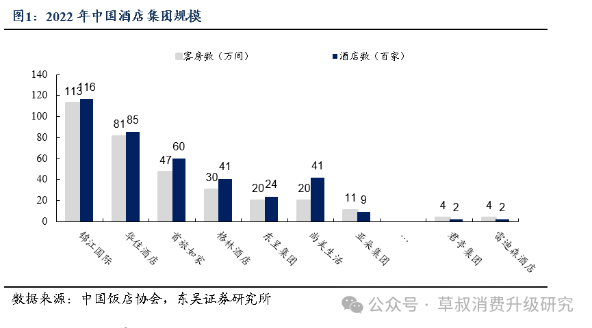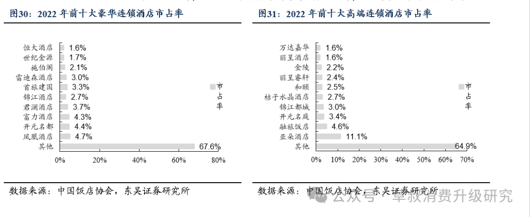 国内高端连锁酒店市场竞争格局分散。截至2022年末,国内前十豪华连锁酒店品牌门店数总计694家,CR10为31.5%。国内前十高端连锁酒店品牌拥有门店1979家,CR10为35.1%。高端以上连锁酒店市场集中度较低。高端品牌和运营能力较为稀缺。