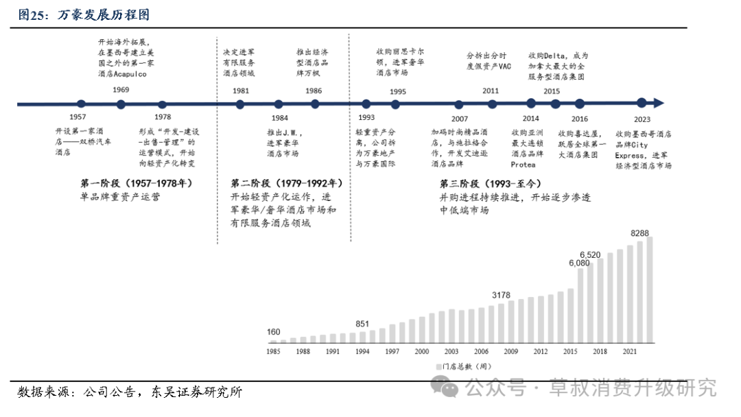持续并购丰富品牌矩阵。万豪酒店于1957年开设第一家酒店——双桥汽车酒店。1979-1992年,万豪先后推出J.W.、万怡、万枫等品牌,进军有限服务酒店领域和豪华酒店市场。1995年,万豪收购丽思卡尔顿,进入奢华酒店市场;1997年,万豪收购万丽,在高端和奢华领域影响力进一步增强。2016年,万豪收购喜达屋,跃居全球第一大酒店集团。随着万豪运营模式渐趋成熟,品牌输出能力不断升级,万豪通过并购Protea、Delta、City Express等经济型品牌丰富品牌矩阵,实现全类型覆盖。
