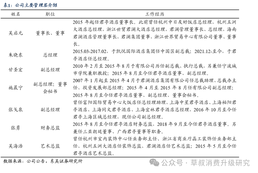 管理层经验丰富。君亭酒店的高管大多由原创始团队组成,具备丰富的酒店业从业经验,具备应对市变化的沉稳和能力。创始人吴启元具有 36 年的酒店管理经验,新上任的总经理朱晓东在中国高星级酒店有长达三十多年的从业经验,曾深度主导北京银泰中心、凯悦国际酒店集团中国区业务的运营。