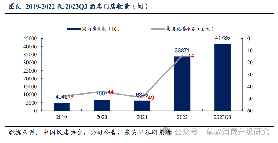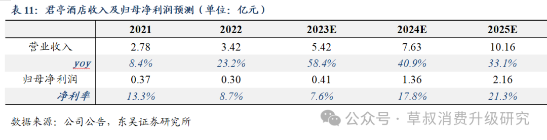 酒店和房间数:轻重资产结合稳步扩张,预期公司直营酒店数2023-2025分别为27/31/35家,加盟酒店数为191/231/293家,合计酒店数为218/262/328家,总房量为41791/50571/63710间。