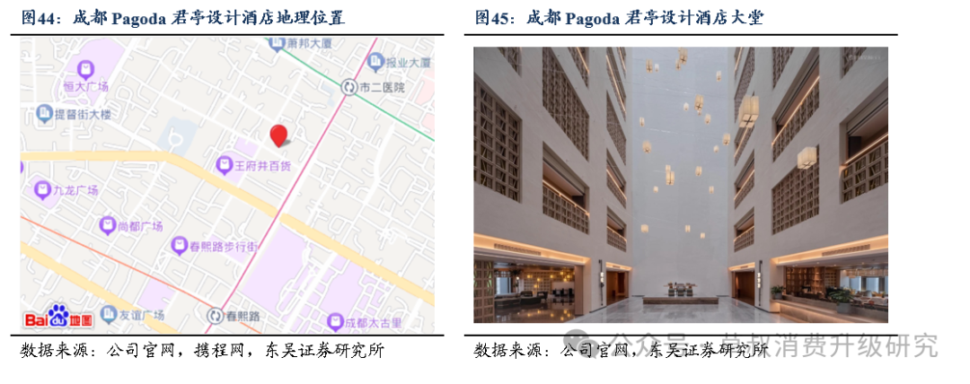 1)现代与传统完美结合,“一城一定”契合成都品味。成都Pagoda于2022年3月开业,属“Pagoda君亭”品牌西南布局首店,成都Pagoda作为首批为城市度假代言的中高端品牌,创新融合现代时尚与中国传统艺术,打造成都品味高端精选酒店。地理位置及酒店内部设计颇有巧思。酒店位于西部文化产业中心高层,处于春熙路商圈,距离成都时尚中心——太古里仅5分钟步程。成都Pagoda大堂结合现代AR交互技术,展示林俊廷先生作品《鎏莹》,中庭采用独特孔明灯设计,营造中式设计氛围。软硬件配置方面,成都Pagoda提倡精选模式,室内陈设最大程度契合奢侈氛围;房间内部均配有熊猫玩偶,高度契合成都文创文化;酒店配有高端会议厅、精品餐厅、健身房等设施,打造兼并社交与办公的成都悠闲氛围复合生活空间。