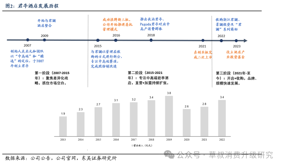第一阶段(2007-2015年):聚焦差异化战略,抓住市场空白。在此阶段中,中国经济型酒店处于高速扩张阶段,但市场中多为经济型酒店,中高端酒店相对较少。由此,创始人吴启元和团队基于当前市场环境做出判断,决定采用差异化战略进行经营,并以“中高端”和“精选”作为其服务定位,于2007年成功创立君亭酒店品牌。2009年,君亭酒店为后续其独立发展以及资本化奠定基础,开始逐步与由南都集团控股、主打休闲旅游度假的君澜酒店进行整合。2015 年 5 月,君亭酒店进行管理层收购,正式完成和君澜酒店的分拆。在此之后,君亭酒店深耕中高端,专注于细分赛道的发展,在2015年营业收入达到2.7亿元。