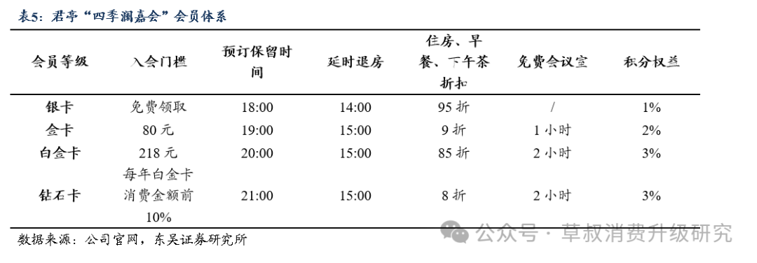 数字化转型助力降本增效,会员体系不断完善。君亭酒店利用募集资金,持续信息化改造,完善信息系统建设,以“规范、高效、智能的酒店业务全过程管理”为核心建立信息化综合管理平台,实现酒店设计、智能化和品牌推广资源的统一集成管理,提升管理效率,降低运营成本。会员体系方面,君亭酒店“四季澜嘉会”会员体系已基本建成,会员等级分为银卡、金卡、白金卡以及钻石卡,在预定、退房以及折扣权益方面给予不同优惠。凭借完善的会员体系,为公司积累大量忠诚客户,截至2023年11月,会员总数已达570万。2023年2月,君亭酒店与中旅集团会员签订战略合作协议,同年11月,两家公司会员系统正式完成互通。会员体系不断完善,构建可持续生长会员生态。