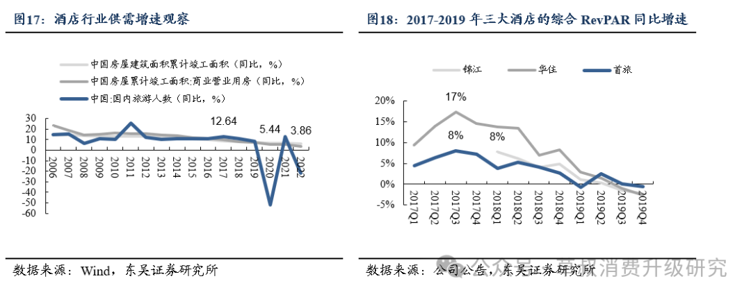 酒店行业的周期体现在两方面:一是一年长度的季度需求周期,二是3-6年不等长度的行业供需周期。季度需求周期的驱动因素是居民出行需求的季度变化,通常Q3是酒店行业最旺季,Q1是最淡季。酒店/住宿业需求从客群辐射范围角度可分为本地需求及长途需求,其中本地客需求相对刚性,长途客需求带来增量波动,从三大酒店集团大陆业务季频间夜数和长途出行旅客人次数据对比来看,二者具有相关性。另一方面,酒店供给端的主要驱动因素是商业营业用房的可用面积,及社会投资意愿,我们在此简化用商业地产可用面积来刻画其供给量的增速。相应的需求端用国内旅游人数增速来刻画居民出行消费量的增速。可以看到过去15年,尤其是2018年以前,仍处在城镇化率快速提升,房地产业持续景气的阶段,酒店行业的基础物业基本为新投入市场的商业营业用房。当时的商业营业用房累计竣工面积同比增速每年都在10%以上。到2019年受宏观调控及产业本身发展阶段影响,供给端持续降速,2018-2022年中国商业营业用房累计竣工面积同比增速分别为8.25%/7.32%/5.44%/5.21%/3.86%。需求端来看,疫情前需求端仅有两个阶段增速超过供给侧,一是2011年的经济恢复年,二是2017-2019年的旅游景气阶段。回顾同期酒店行业经营数据,在2017-2019年经营数据兑现出了持续景气,RevPAR持续上涨,直到2019年下半年转为负增长。