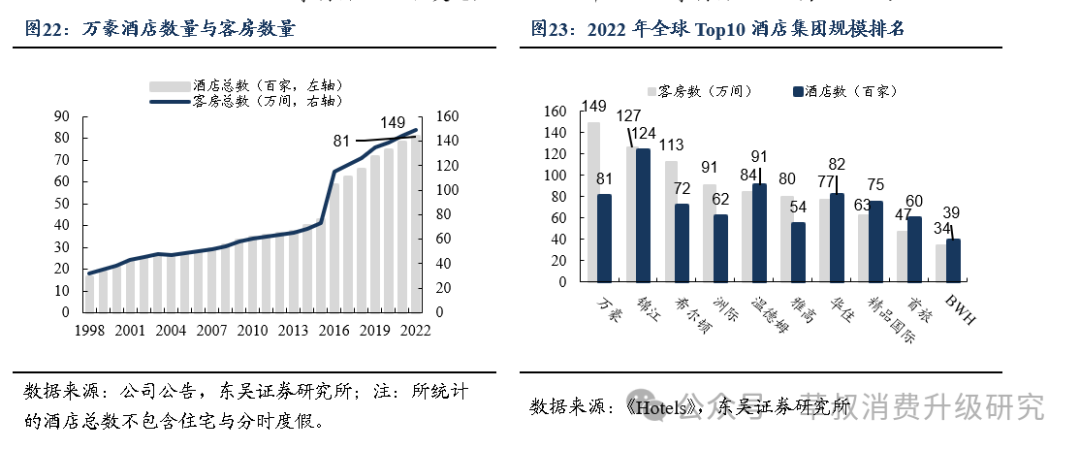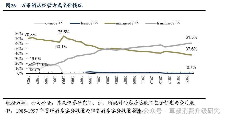 单品牌重资产自营起家,轻资产化运作助力品牌化扩张。发展初期以物业自持的重资产运营模式扩张;1978年形成“开发-建设-出售-管理”模式后开始向轻资产化转变,委托管理模式下,业主方委托万豪国际负责酒店的经营和管理,万豪派驻管理人员,收取基本管理费、奖励管理费、费用返还等,1985年万豪委托管理酒店数量占比达70.8%。1993年万豪原公司拆分为万豪地产与万豪国际,实现轻重资产分离,负债与酒店物业分至万豪地产REITs,万豪国际专营酒店经营管理,此后万豪国际通过与万豪地产协同发展,加速全球扩张。万豪REITs利用资产证券化回笼现金流,并持续收购有升值潜力的高端、奢华酒店物业,并投入资本开支提升物业价值,由万豪国际负责运营管理,获得稳定回报;同时出售非核心资产,获得资金回流,用于收购更有价值的物业,不断优化资产组合。特许经营模式下,万豪国际授权业主方使用酒店品牌和运营系统等,万豪不负责酒店日常管理运营,收取特许加盟费和费用返还。截至2022年,特许经营酒店客房数占总数61.3%,以委托管理与特许经营为主的轻资产经营模式占比98.9%。