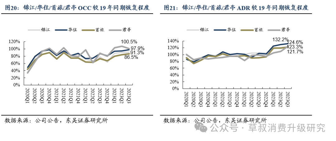 居民出行意愿恢复带动酒店经营数据反弹。2023年Q3,龙头酒店企业锦江酒店/华住酒店/首旅酒店/君亭酒店RevPAR分别为190.36/278/185/369.89,较19年同比增长12.64%/29.30%/5.71%/25.2%。RevPAR的增长部分得益于酒店房价增长,锦江酒店/华住酒店/首旅酒店/君亭酒店ADR为265.5/324/258/530,较19年同比增长均超20%。四家酒店2023年Q3的OCC分别为71.67%/85.9%/71.5%/69.8%,恢复至19年同期91.3%/97.9%/86.5%/100.5%,以上市公司为代表的酒店逐步复苏。