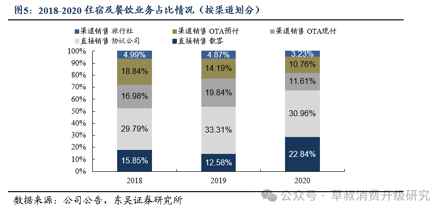 酒店住宿及餐饮业务直销渠道占比较高。公司加大直销渠道客源的拓展力度,叠加疫情期间旅行社业务供应链影响渠道销售,直销收入占比从2018年的45.64%提升至2020年的53.77%。公司不断拓展直接销售的渠道,包括增加企业客户数量、不断推广微信订房、官网订房等各种方式来稳定直销渠道,保持业务规模。
