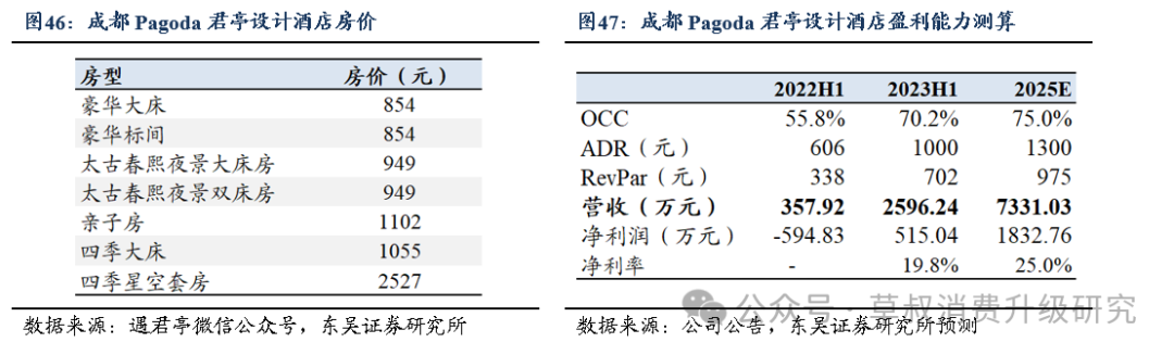 2)差异化定位提高溢价能力。成都Pagoda开业以来独特的设计风格吸引大量顾客打卡,小红书上成都Pagoda酒店tag热度达17万次浏览。2023年H1,成都Pagoda实现营业收入2596.24万元,RevPAR为702元,同比+108%,净利润为515.04万元,净利率为19.8%,我们预计未来成都Pagoda业绩将继续爬坡,盈利能力体现品牌溢价力。