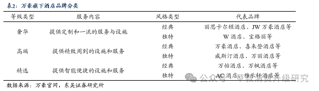 品牌覆盖奢华-精选系列,业务布局较为综合。万豪旗下奢华品牌包括丽思卡尔顿、宝格丽和JW万豪等,旨在为高净值消费者提供奢华的个性化服务;高端品牌包括喜来登酒店、万豪酒店、威斯汀酒店等,主打精致周到的服务,为住客提供全方位的品牌体验;精选品牌包括万怡酒店、万枫酒店等,将为住客提供智能便捷的服务;长住品牌包括万豪行政公寓、Residence Inn等。不同档次品牌服务内容差异化,形成较为综合的业务布局。