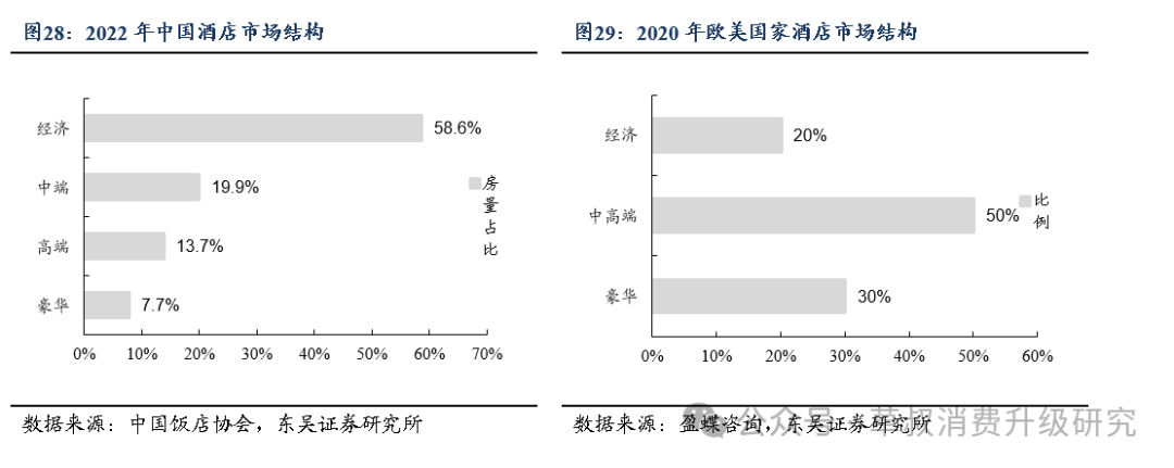 国内高端酒店行业供给少,存在结构性机会。按客房数计,截至2022年末,经济型酒店仍在我国酒店行业中占据主导地位,经济型占比58.6%,高端+豪华品牌房量仅占21.4%,高端酒店供给较少。与欧美国家酒店市场结构相比,我国高端酒店市场仍处于发展期,存在结构性机会。