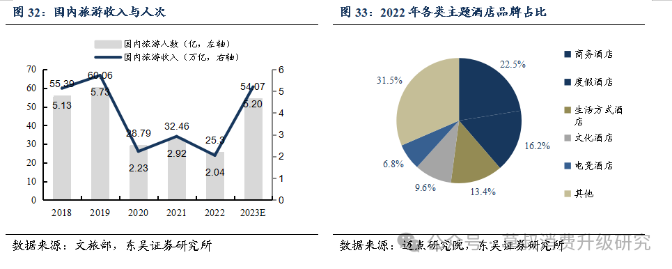 旅游市场复苏,度假酒店发展势头强劲。据中国旅游研究院预测,2023年国内旅游收入预计为5.2万亿元,国内旅游人数将达到54.07亿,同比增长154.4%/113.7%,分别恢复至19年的91%/90%,旅游市场复苏凸显,为度假酒店发展提供机遇。2022年,度假酒店在主题酒店品牌分类占比达16.2%,2023年Q1,新开业的高端酒店中,度假酒店占比23.73%。随着生态体验、城市旅行、康养旅居等旅游主题热度暴涨,度假酒店发展可期。