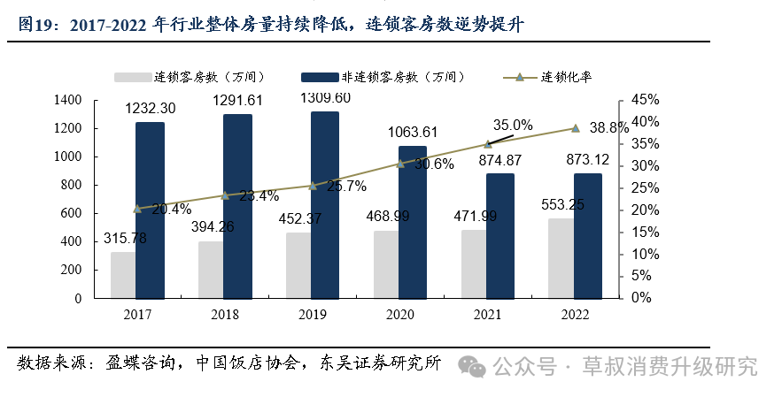 疫情下行业出清加速,单体酒店抗风险能力差,总数下滑明显。2020年开始受到疫情影响,酒店住宿业门店总数开始明显下滑,2019-2022年酒店住宿业门店数CAGR为-6.2%。其中关闭或歇业的主要为单体酒店,2019-2022非连锁酒店客房数CAGR为-12.6%;与此同时,连锁客房总数仍然呈现稳步增长,2019-2022连锁客房数CAGR为6.9%。行业产能的整体出清及连锁房量的逆势提升,使得行业连锁化率呈现加速提升的趋势。这是由于疫情下单体酒店抗风险能力差,较难承担疫情反复带来的冲击,选择暂时或永久退出行业,或加盟连锁酒店集团强化管理和引流能力。