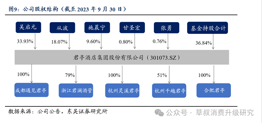 创始人控股,高管持股63.16%,利益深度绑定。截止2023年Q3,君亭酒店创始人吴启元先生持股6597.7万,占公司总股份的 33.93%,为公司的控股股东,担任公司的董事长兼法定代表人。公司高管从波、施晨宁、甘圣宏及张勇先生多为君亭创始团队成员,分别持18.07%、9.6%、0.8%、0.76%。2023年11月29日,君亭为完善治理结构,推动公司的规范运作,制定《独立董事工作制度》,进一步促进公司长远稳定发展。