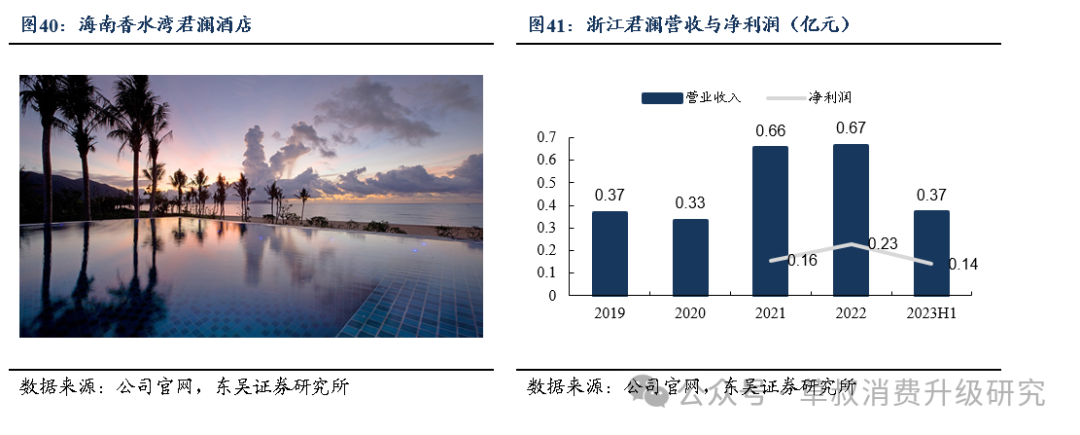 疫情期间君澜逆势扩张,业绩表现亮眼,2022年营业收入达0.67亿元,净利润达0.23亿元。得益于暑期亲子游趋势火热上升,君澜品牌旗下成熟酒店2023H1营收同比增长157%,其中广西、海南度假市场表现良好,广西巴马君澜度假酒店营收较2019年同期+109%,海南香水湾君澜度假酒店营收较2019年同期+43%,七仙岭君澜度假酒店营收超19年同期28%。