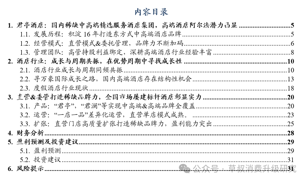 君澜:深耕高端度假领域,打造优质度假圈。君澜依托滨海、温泉、古城古镇等优质旅游目的地,整合景区和物业资源,打造“四南一北”全国度假圈布局,有机结合中国各地地域文化、民族文化以及特色文化,为消费者提供类别丰富的高端休闲度假产品。得益于中式文化融合服务和优质旅游资源整合,君澜已形成国内规模最大、门类最齐全的大型度假酒店运营商,在新增项目数量、资源性项目占领上具备领先优势,引领高端度假行业发展。