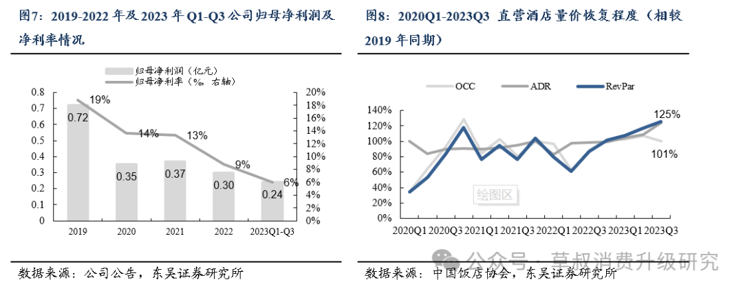 新开直营店拖累盈利水平,未来有望释放业绩弹性。疫情期间归母净利润大幅下滑,2021年由于集团旗下酒店运营状况改善,归母净利润同比增长5.28%。直营店爬坡期显著影响公司利润水平。2022年新开业的成都Pagoda君亭设计酒店出现较大亏损,归母净利润同比下滑18.3%。2023年居民出行需求显著恢复,盈利能力大幅修复,由于新增直营店爬坡期和资产处置损益拖累,Q3归母净利润和净利率承压。未来随着直营店业绩持续爬坡,有望释放业绩弹性。