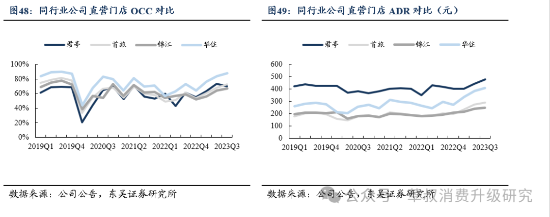 重点打造直营项目,高质量扩张持续提升盈利能力。公司直营项目盈利能力强劲,回报率可观。君亭新增直营店爬坡期缩短,仅需约2年,且爬坡期与成熟期入住率高,分别为68%/75%,新增直营项目有望为公司收入贡献增量。由于君亭酒店体量较小、酒店定位偏高端,直营店OCC略低于同行业公司,2023Q3君亭直营店OCC为69.8%。由于君亭产品高端化,ADR显著领先行业,拉动作用RevPAR表现高于同行业水平,2023Q3君亭酒店直营门店ADR达478.48元,RevPAR达369.89元,直营项目盈利能力领先同行业公司,实现高质量扩张。