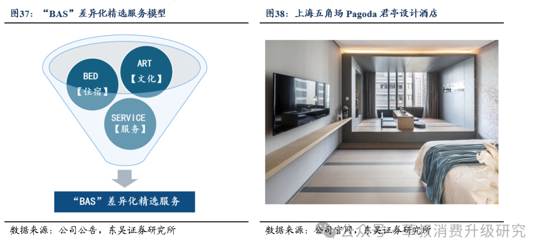 君亭首创“BAS”模式,提供差异化精选服务。“BAS”模型即“Bed住宿+Art文化艺术+ Service服务”三位一体,以产品为基础,不断提升品牌及体验。君亭立足于“BAS”模式,形成“产品精选、文化精选及服务内容精选”的君亭特色服务体系。“Bed”方面,君亭注重核心产品品质,酒店设施选取高档次、高品质的硬件产品,为顾客提供舒适体面的入住体验。“Art”方面,君亭针对不同品牌调性注入不同东方文化元素,强调差异化文化设计,运用设计元素赋能核心产品。“Service”方面,君亭针对目标消费群体需求提供差异化精选服务,以细腻的服务风格为核心产品附加价值提升持续注入新动力。