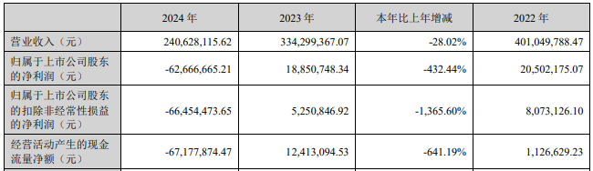 2024年,多瑞医药营业收入为2.41亿元,同比下降28.02%;归属于上市公司股东的净利润-0.63亿元,上年同期为0.19亿元;归属于上市公司股东的扣除非经常性损益的净利润-0.66亿元,上年同期为0.05亿元;经营活动产生的现金流量净额为-0.67亿元,上年同期为0.12亿元。
