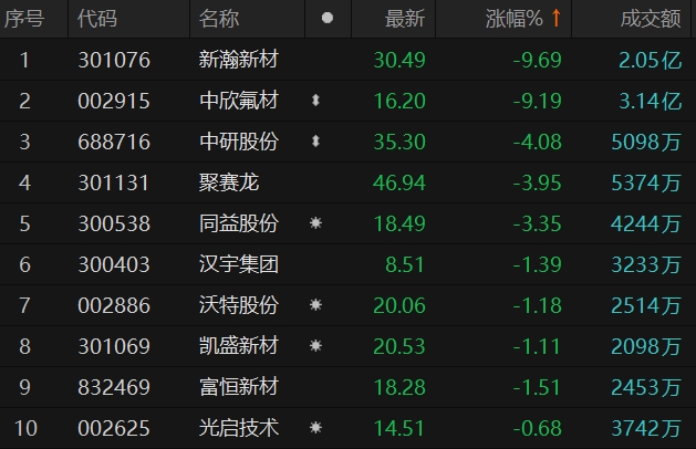 1月4日,PEEK概念股下挫,截至9时55分,新瀚新材跌近10%,中欣氟材跌超9%,中研股份、聚赛龙、同益股份等跟跌。