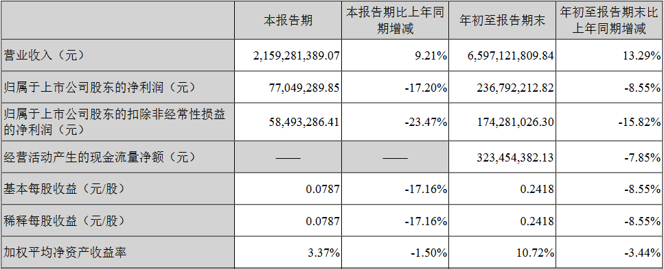 2021年前三季度,孩子王实现营业收入65.97亿元,同比增长13.29%;实现归属于上市公司股东的净利润2.37亿元,同比下降8.55%;实现归属于上市公司股东的扣除非经常性损益的净利润1.74亿元,同比下降15.82%;经营活动产生的现金流量净额为3.23亿元,同比下降7.85%。